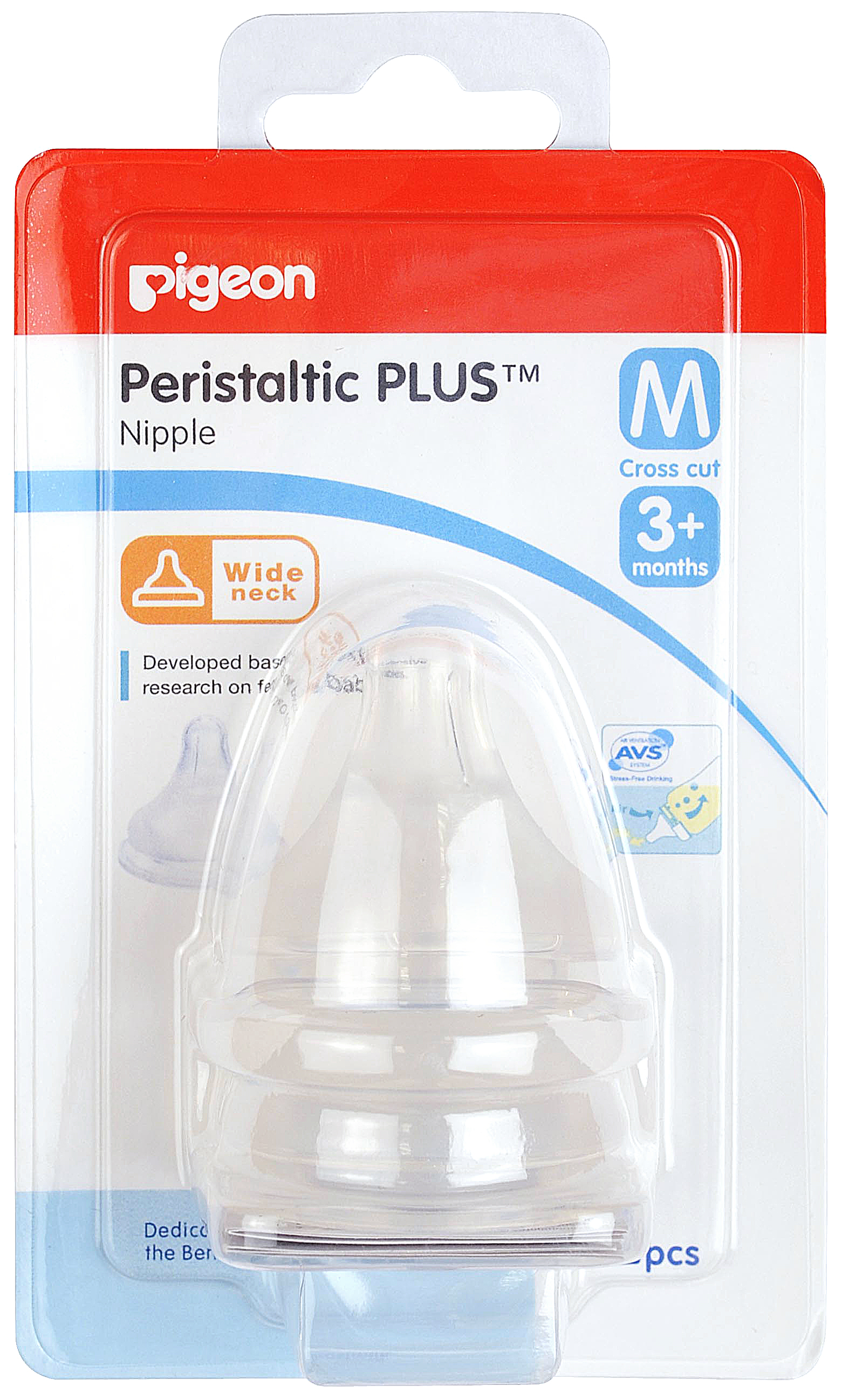 Перистальтическая силиконовая соска для бутылочки с широким горлом, отверстие M. Уникальная особенность соски - гофрированная структура верхней части, обеспечивает естественные перистальтические движения языка младенца, такие же, как при сосании материнской груди, тем самым риск отказа от груди после кормления из бутылочки Pigeon сведен к минимуму.
