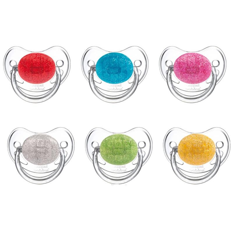 Пустышка силиконовая круглая коллекция Лунный свет Canpol. Пустышка с прозрачным основанием и кольцом, цветной диск содержит искрящиеся частички, создающие эффект мерцания. Основание пустышки с отверстиями для вентиляции, исключающими раздражение нежной кожи малыша.