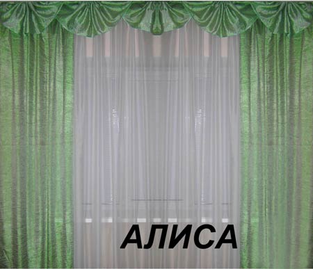 Комплект штор "Алиса" отшивается из блестящей жатки, которая очень хорошо сверкает при искуственном цвете.