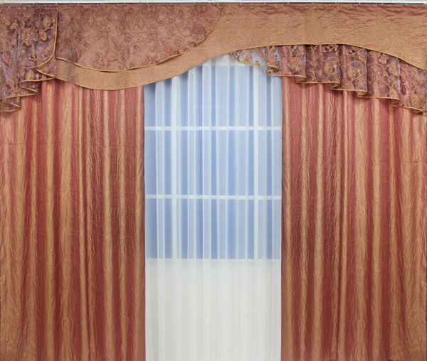 Комплект штор "Дюна" отшивается из блестящей жатки. Оригинальный, привлекающий внимание ламбрекен шириной 3 метра смоделирован из основной ткани и органзы с волнами.