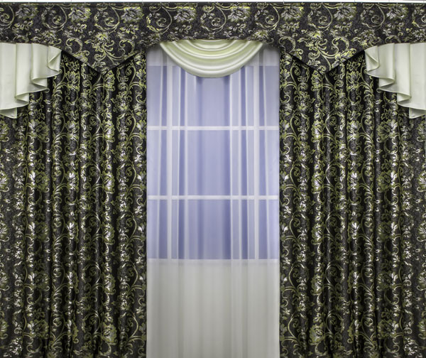 Комплект штор "Магия" изготавливается из тёмной, почти чёрной жаккардовой ткани в сочетании с атласом. Такое решение - тёмное основание и светлый блестящий рисунок оживит любой интерьер.