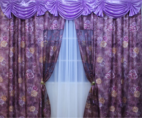 Комплект штор "Мечта" отшивается из портьерной ткани и органзы-компаньона. Ширина двух штор 4 м, ширина ламбрекена из однотонного атласа 3 м, высота 2,5 и 2,7 м.