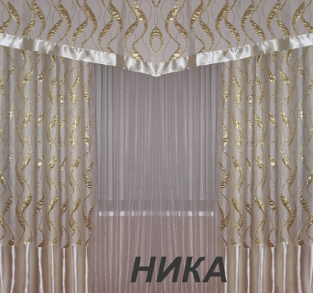 Комплект штор "Ника" изготавливается из плотной портьерной ткани с блестящим рисунком. Вставки из атласа по краю ламбрекена и низу штор удачно сочетаются с основной тканью. Строгий ламбрекен подойдёт для любого интерьера.
