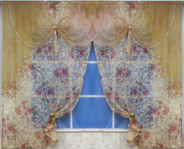 Кухонный комплект "Аврора" отшивается из жаккардовой органзы с печатным рисунком шириной 2,8 м, высотой 1,8 м. Ламбрекен отшивается из однотонной органзы шириной 2,8 м.