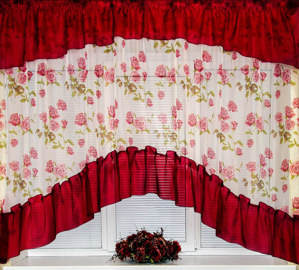 Кухонный комплект "Марта" отшивается из печатной вуали и однотонной вуали. Ширина комплекта рассчитана на широкое окно - 2,8 м, высота - 1,7м (до подоконника).