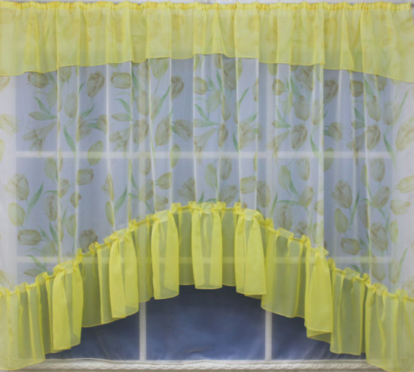 Кухонный комплект "Марта" отшивается из печатной вуали и однотонной вуали. Ширина комплекта рассчитана на широкое окно - 2,8 м, высота - 1,7м (до подоконника).