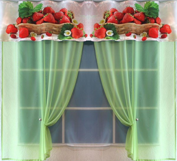 Отличительная особенность этих штор для кухни - ламбрекен из ткани "сатен" с нанесением фотопечати. Его ширина 2,7 м, высота 0,5 м. Цвет вуали и ламбрекена можно комбинировать по Вашему желанию.