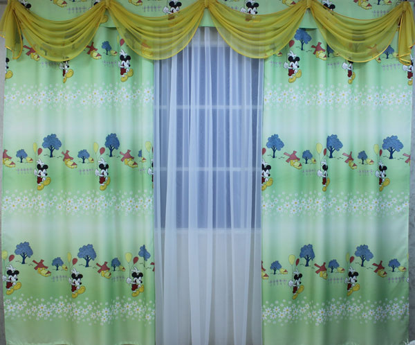 Комплект штор для детской комнаты "Сказка" отшивается из печатной портьерной ткани шириной 3 метра. Ламбрекен шириной 3 метра комбинированный, отшивается из однотонной вуали и основной ткани.