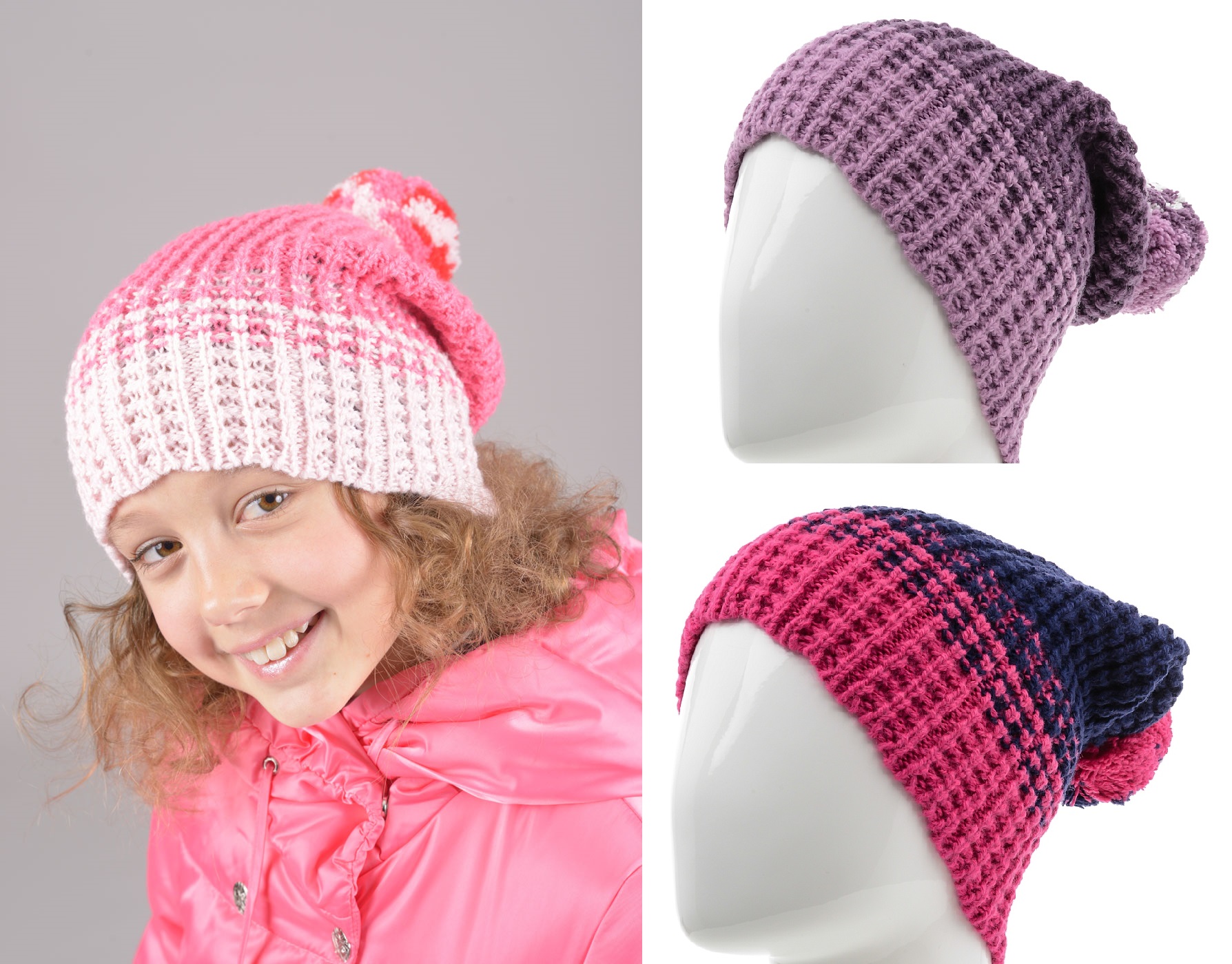 Изящная шапка для девочки из мягкой полушерстяной пряжи. Связана красивым прессовым переплетением, имитирующим ажур, благодаря которому создается эффект легкости и воздушности изделия. Шапка удлиненной формы с модным разноцветным помпоном на макушке. Прекрасный аксессуар для прохладной демисезонной погоды. Такую удобную стильную шапку ребенок будет носить с огромным удовольствием.