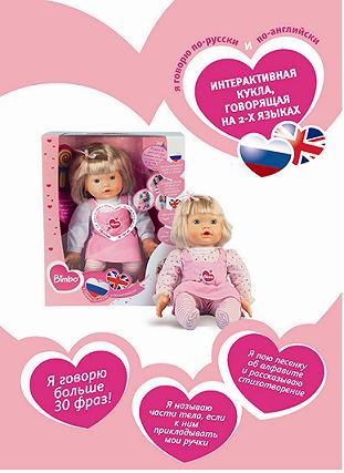 Приложите ручку куклы ко рту, и она скажет: «Мой ротик», «Это мой ротик», «Я могу послать воздушный поцелуй», «Чмок!», «Поцелуй меня, мамочка», «Можно мне конфетку?», «Бр-р-р-р-р», - и расскажет потешку про козу рогатую.