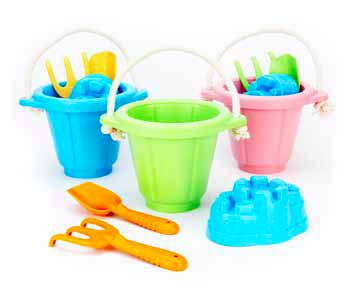 Ведёрко: диаметр верхней части - 18,4 см., нижняя часть – 8,9 см., В – 15,2 см.. Лопатка: Д - 21,6 см.. Грабли: Д - 20,3 см. Форма: 16,5 см. х 10,2 см.х 7,6 см. (Д х Ш х В).